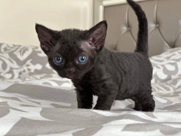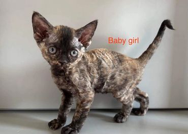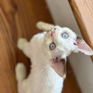 Devon Rex is active, mischievous, playful, and very people-oriented. They have been described as a cross between a cat, a dog and a monkey. They are very intelligent breed; the typical Devon Rex can be trained to walk on a leash, fetch or perform all manner of tricks. This breed very affection, they like to be close to the head, neck and can often be found mounted upon shoulder.